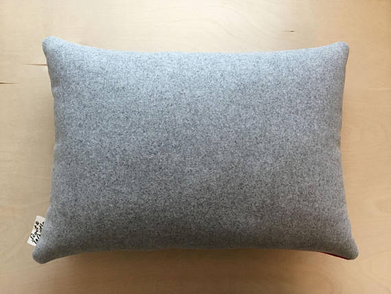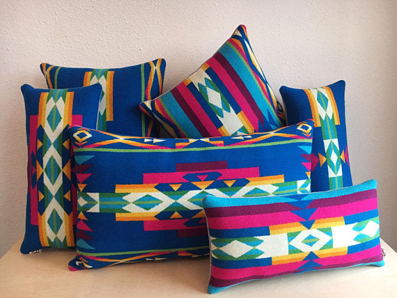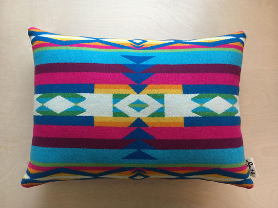 This pillow is hand sewn and made with a limited edition Pendleton wool. The front is bright aqua, royal blue, fuschia, yellow, green and white with the reverse side in heathered light grey. It is stuffed with hypo-allergenic, eco-friendly batting.