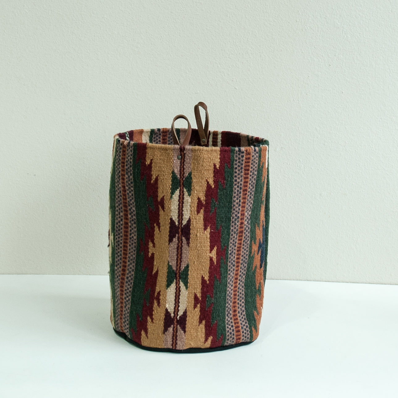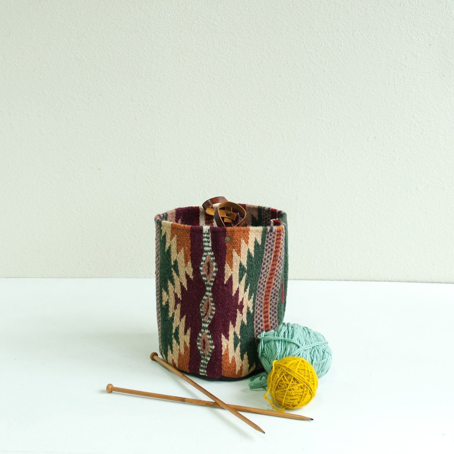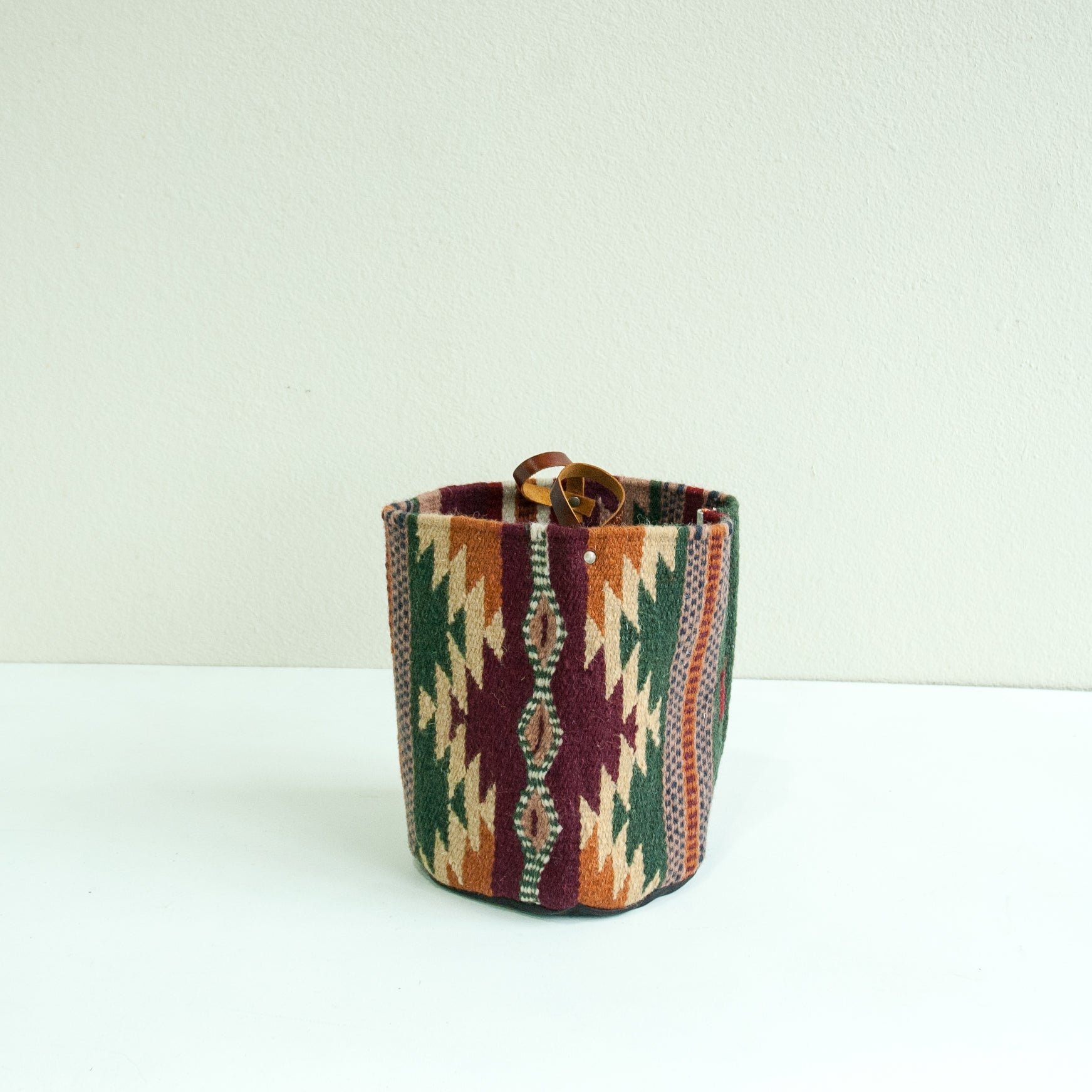 Warm up your living space with this vibrant fabric piece. Great to cover up a plant pot, or makes a perfect little knitting or project basket. Handmade from new saddle blanket weight fabric made from a wool/poly blend. The bottom is made from heavy duty waxed black canvas. Leather handles secured to the bucket with rivets.