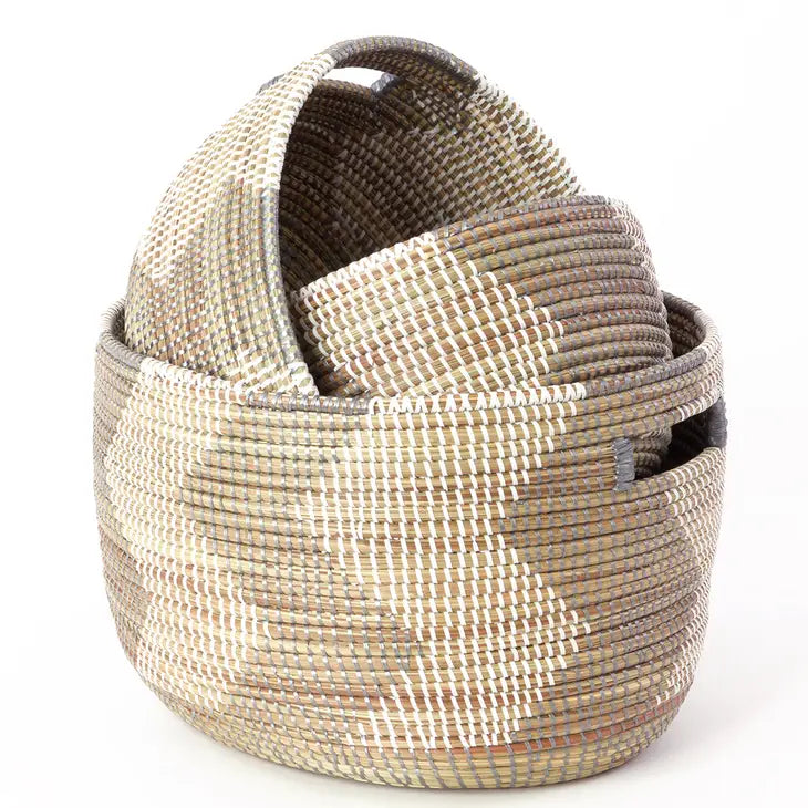 Handwoven by skilled Wolof women in Senegal, West Africa, this lovely set of three baskets is crafted from cattail stalks and salvaged plastic strips used to make mats, Great for crafts or storage in any room of the home. Handcrafted following Fair Trade Federation guidelines and sourced from a women-owned business in Eugene, OR.